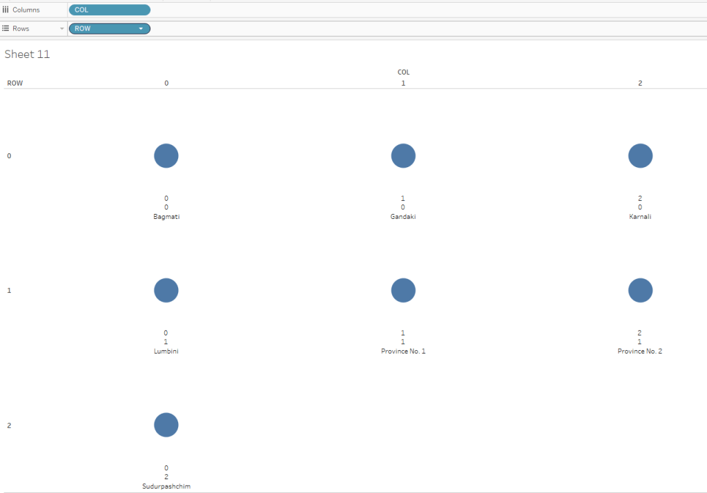 Each Nepali province where houses were built is shown as one house in this viz. I used small multiples to show each province in the view. For this viz, we’ll manually create our row and column values for the view because a table calculation can’t be used as input to MAKEPOINT( ).