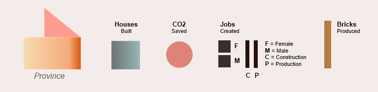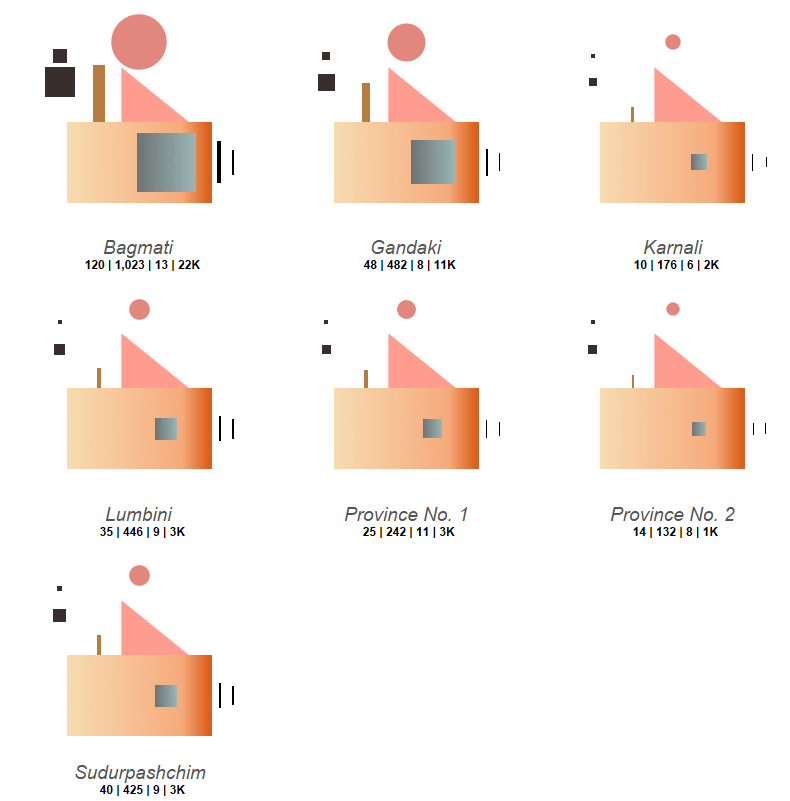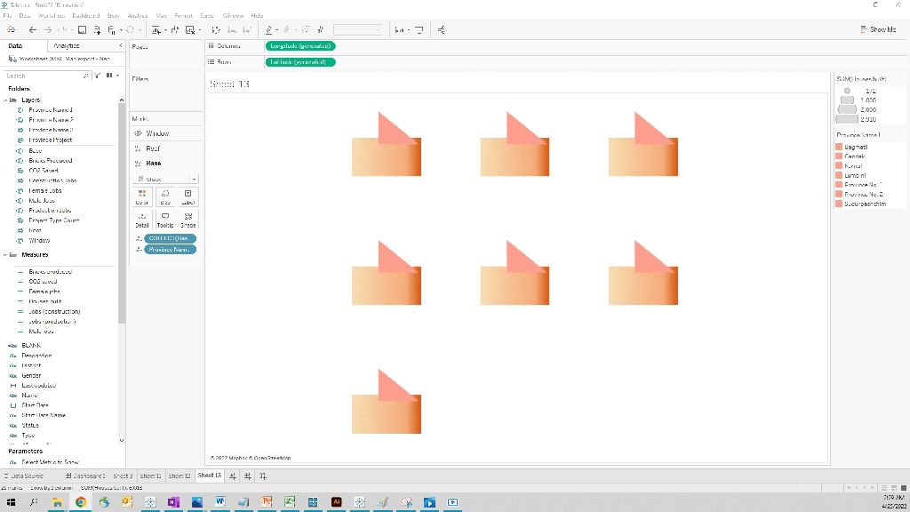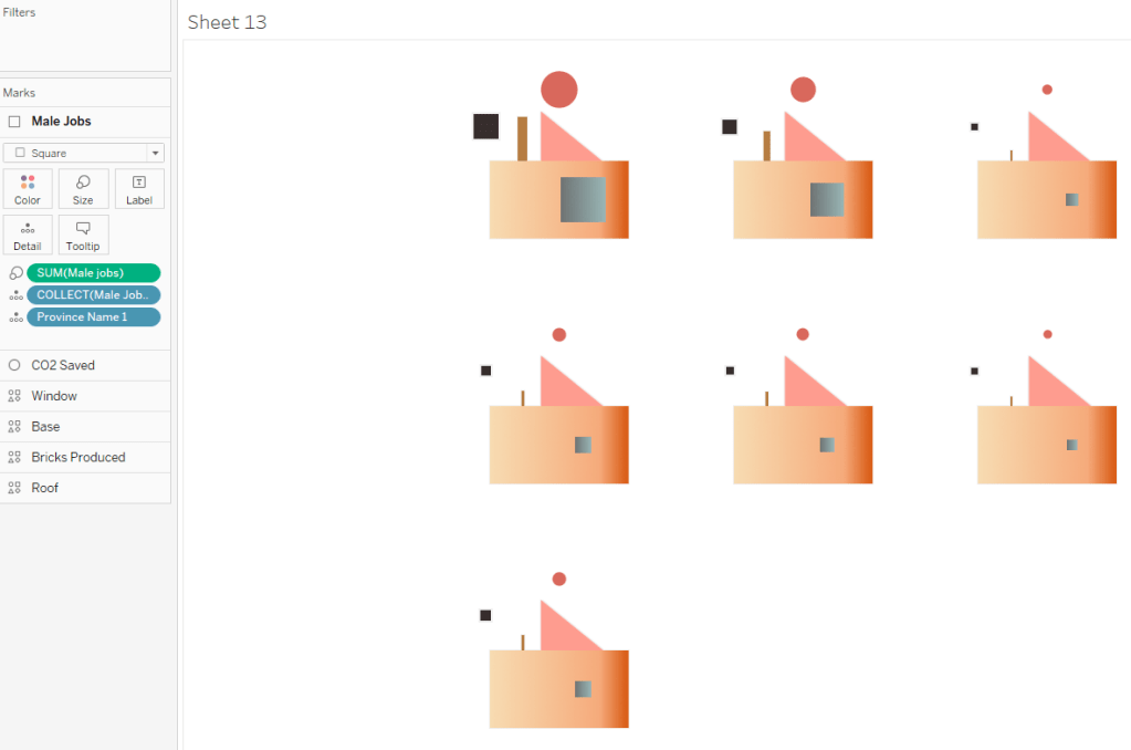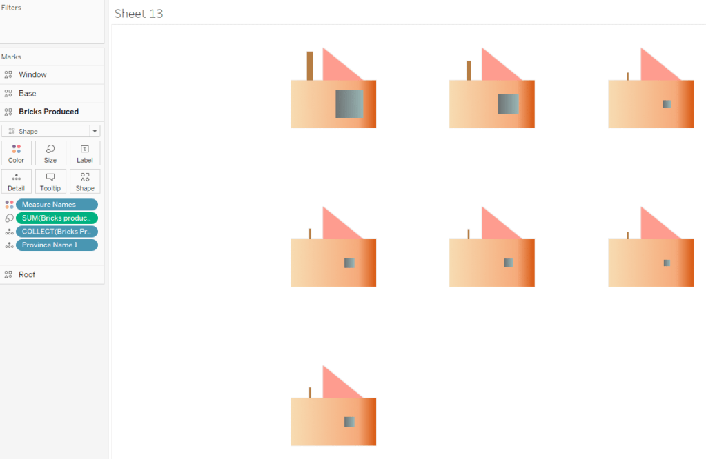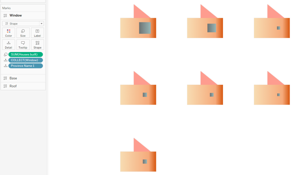 This viz has seven metrics to encode. Therefore, we need nine shapes and layers to build a full house: Seven shapes for our seven measures + two additional shapes because our base for showing province names comprises two layers ( A base and a roof ).