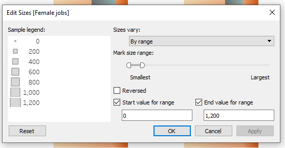 Also, use the Female Jobs measure instead of the Male Jobs measure. - Edit the size range of the Male and Female Jobs shapes marks to match – This ensures that the squares are sized proportionally for an accurate visual comparison