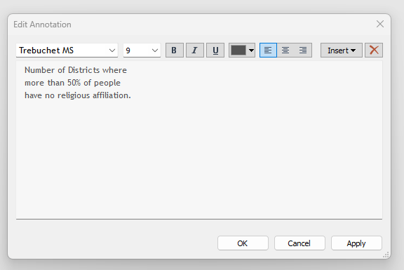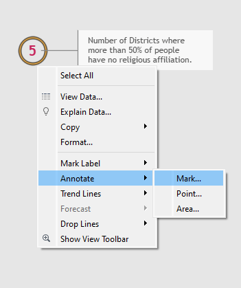 You can type whatever you like in the text box. Tableau also lets us leverage fields in the view when creating the annotation. In this case, I typed out simple text.