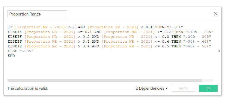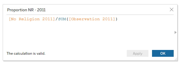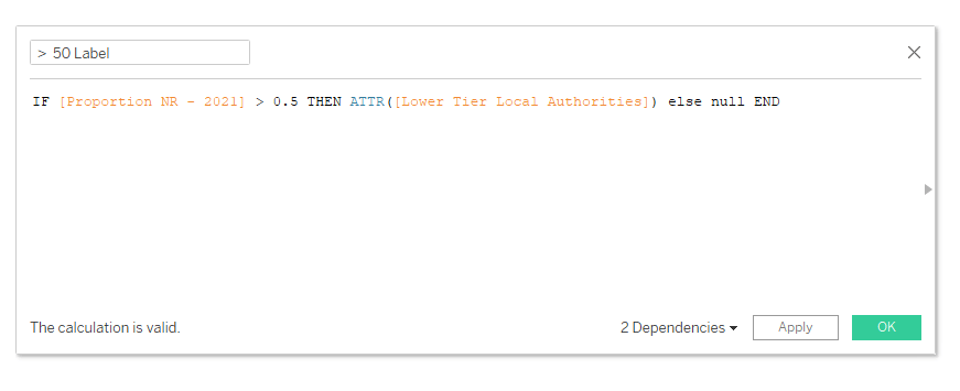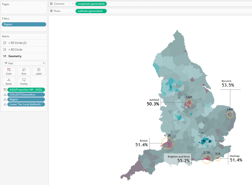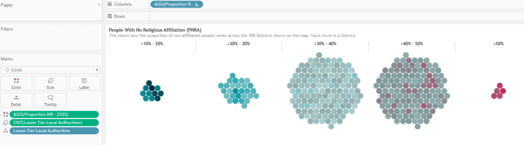 After calculating the percentage of people with no religious affiliation and exploring the local authority districts, I noticed it ranged from 10.6% to 55.2%. So I used a formula to break them out: