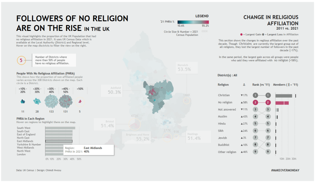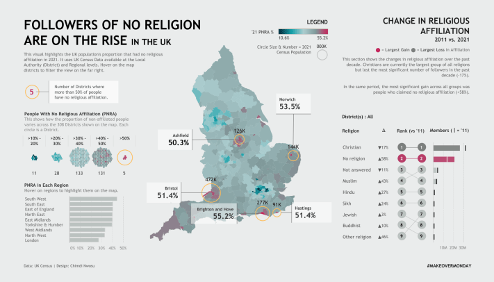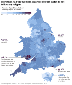 For this week, we had to re-viz a map from the Guardian showing the proportion of people in the UK who follow no religion: