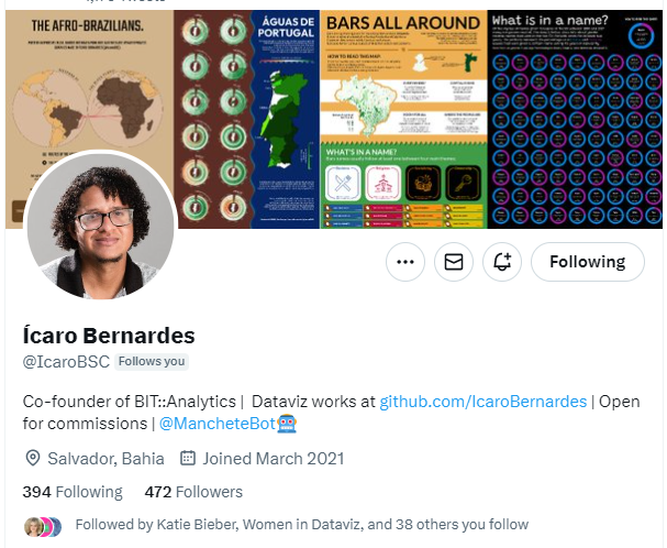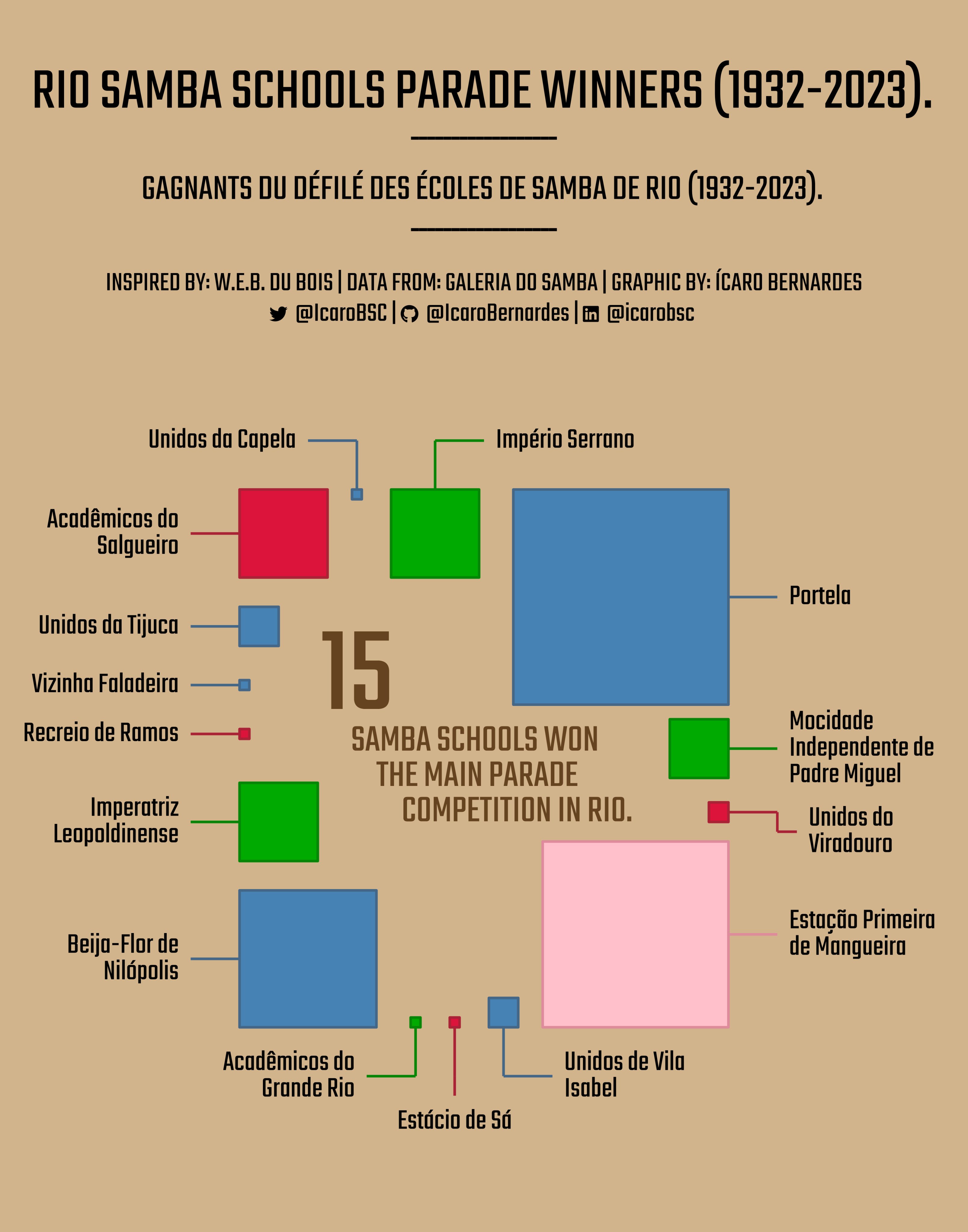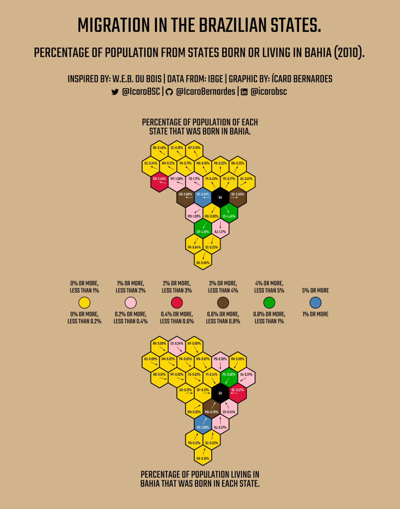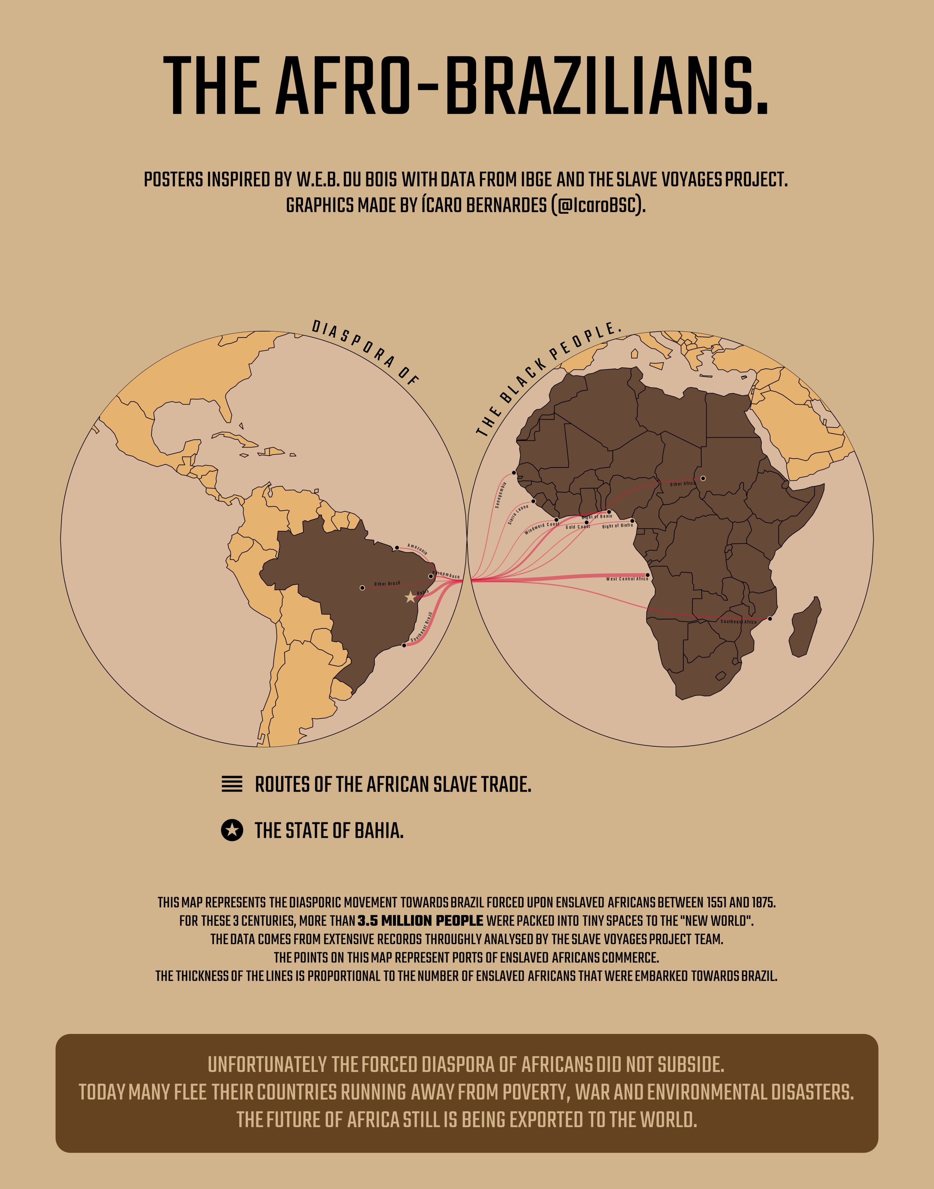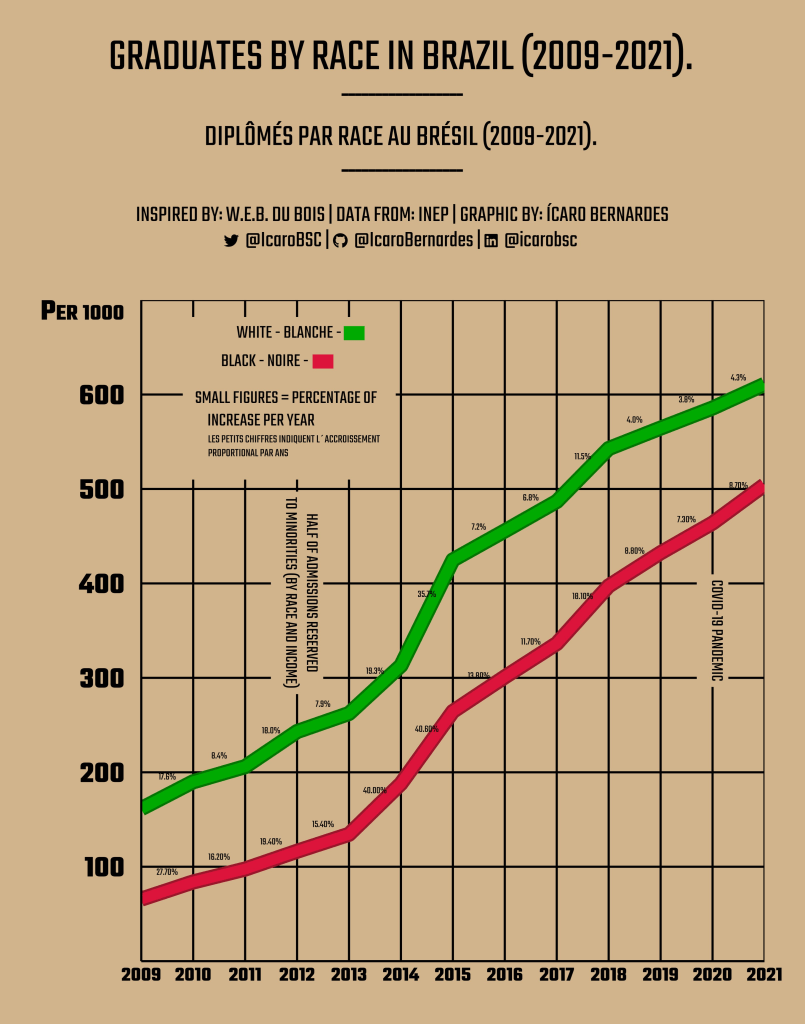 “Initially, I took on the DuBois Challenge to hone my dataviz skills in R. As it would be a fun way to do so. When I started, I decided that my main focus wouldn’t be a reproduction of the plots but rather an adaptation of their design to Brazil’s data. Thus, since last year I’ve been making posters that show racial inequality in the country. Currently, I see the Challenge as a way to connect to the African Diaspora around the globe. People who I don’t think I would get to know otherwise. It also is a stage to bring knowledge to people and promote Social Justice. Moreover, I’m always left in awe by the small tricks that the DuBois team used to solve visualization problems. The fan chart is an intuitive comparison tool, while the spirals are a compact way to show huge differences in data.”