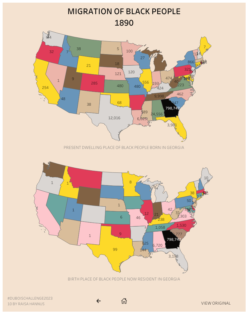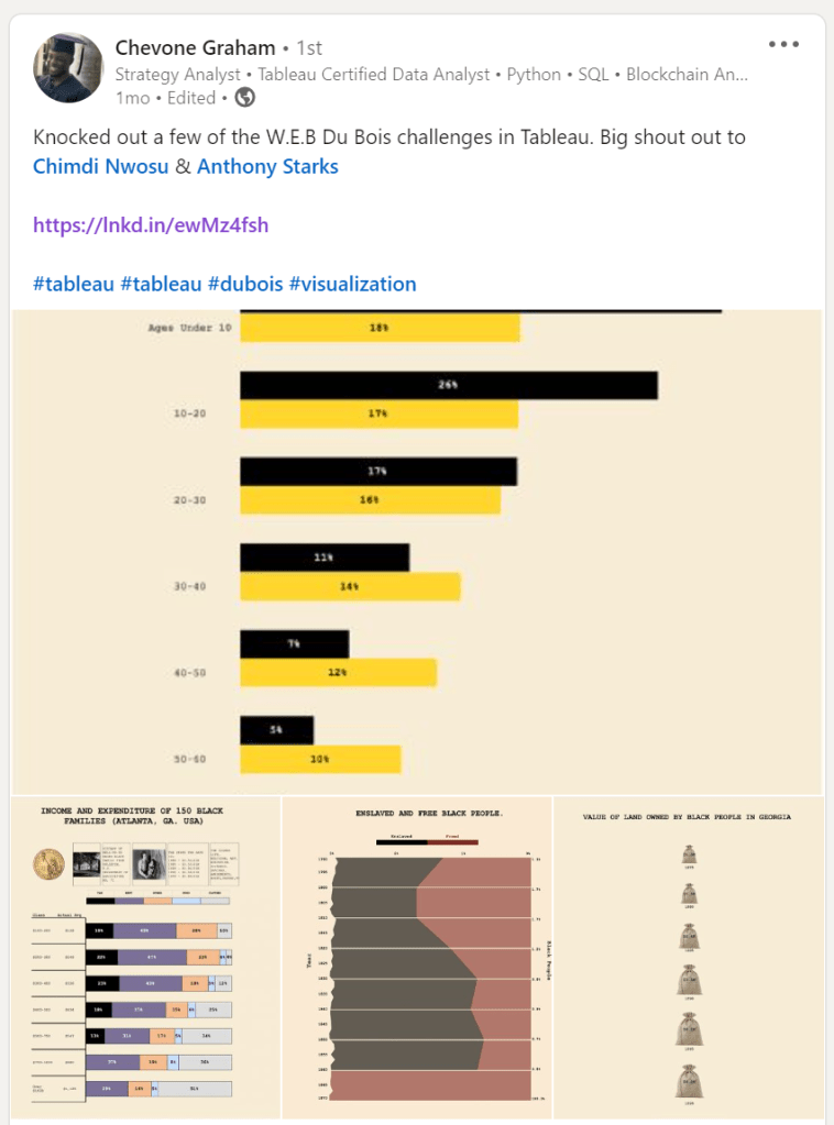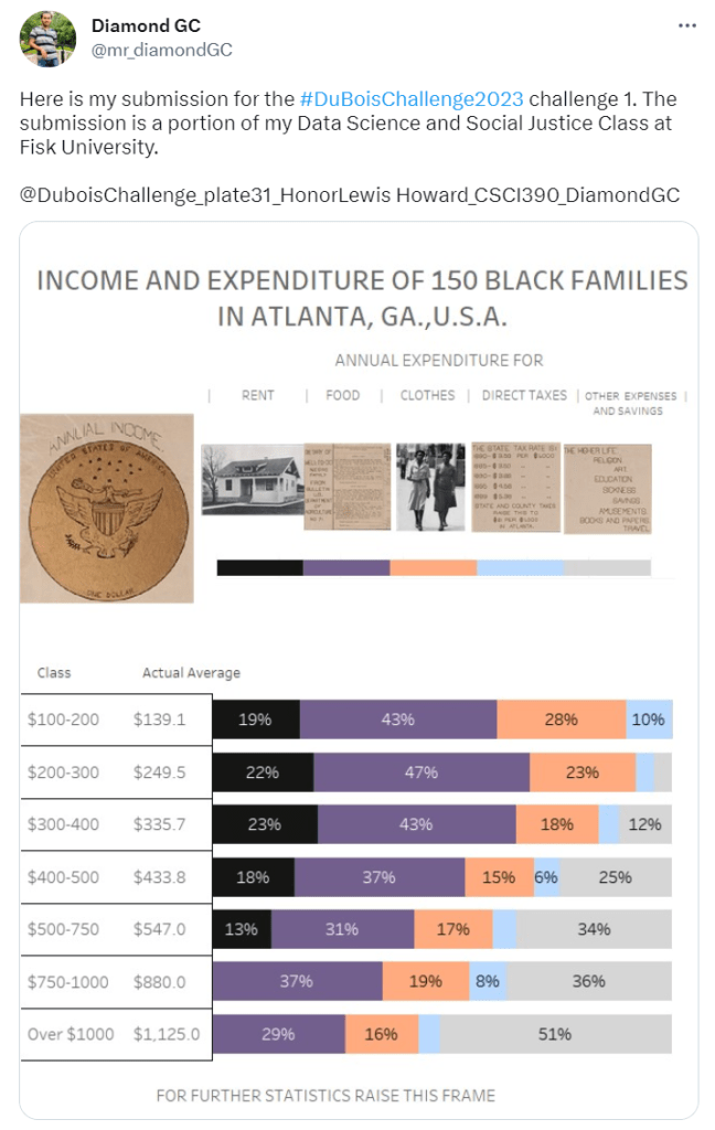 “Although I have not completed all the 10 graphics yet, I can tell you that many participants of the challenge have found it to be a valuable experience in terms of expanding their skills and knowledge in data visualization, as well as their understanding of the important issues of racial and social justice that the challenge aims to address. For those who are passionate about using data to drive positive change in the world, the DuBois Challenge provides a unique opportunity to showcase their skills while contributing to a larger community effort. The challenge is not just a technical exercise, but an opportunity to engage with important social issues and to use data visualization as a tool for advocacy and change”