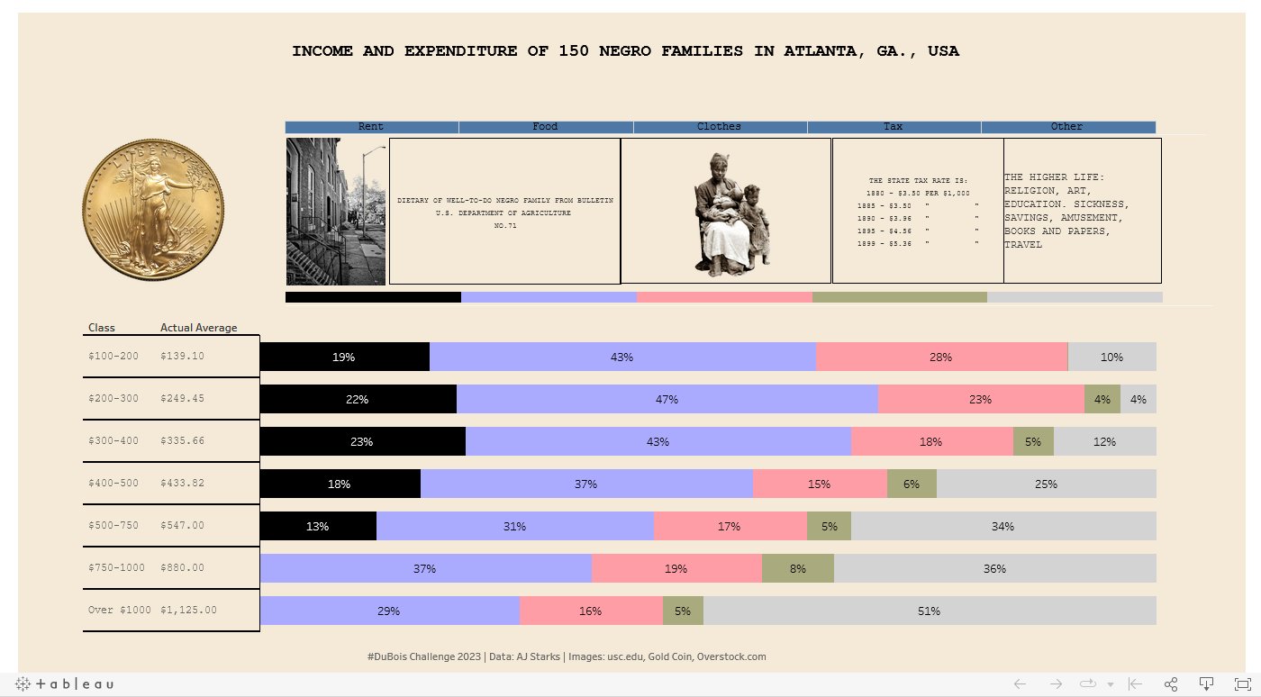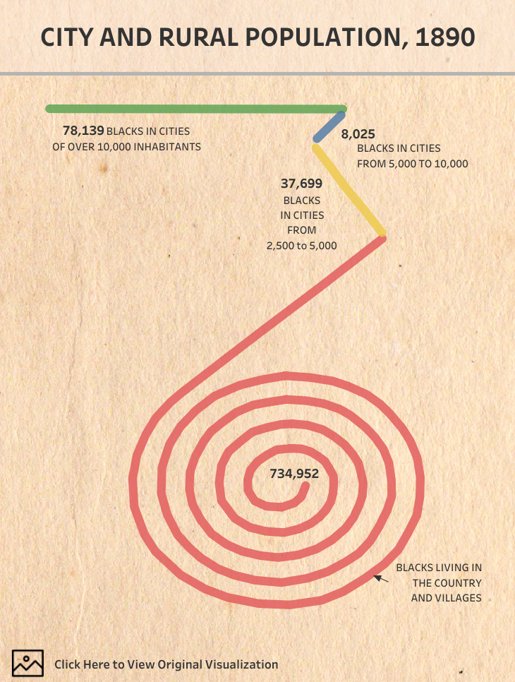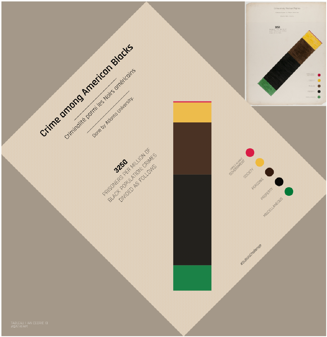 “I began my Tableau journey in 2022 and whilst learning the software, honing my creativity on dashboards and vizzes, and integrating myself into #datafam Twitter, I discovered Chimdi’s DuBois gallery on Tableau Public and Twitter and fell in love. The bold colors, the unique chart types (spirals, fan chart etc), and even learning a new DuBois fact (I had no idea he made hand-crafted charts) got me keen to recreate these charts.
