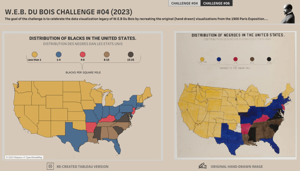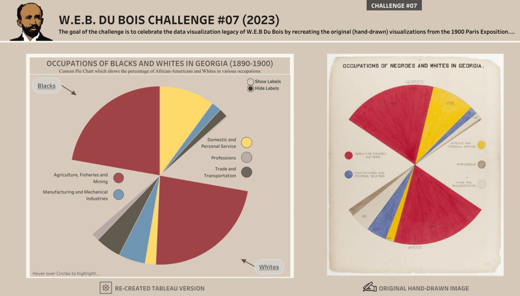 To celebrate Black History Month and honor the legacy of W.E.B. DuBois, data viz practitioners and enthusiasts from around the globe come together to recreate DuBois’ hand-drawn data portraits using modern tools like Tableau, R, and more.