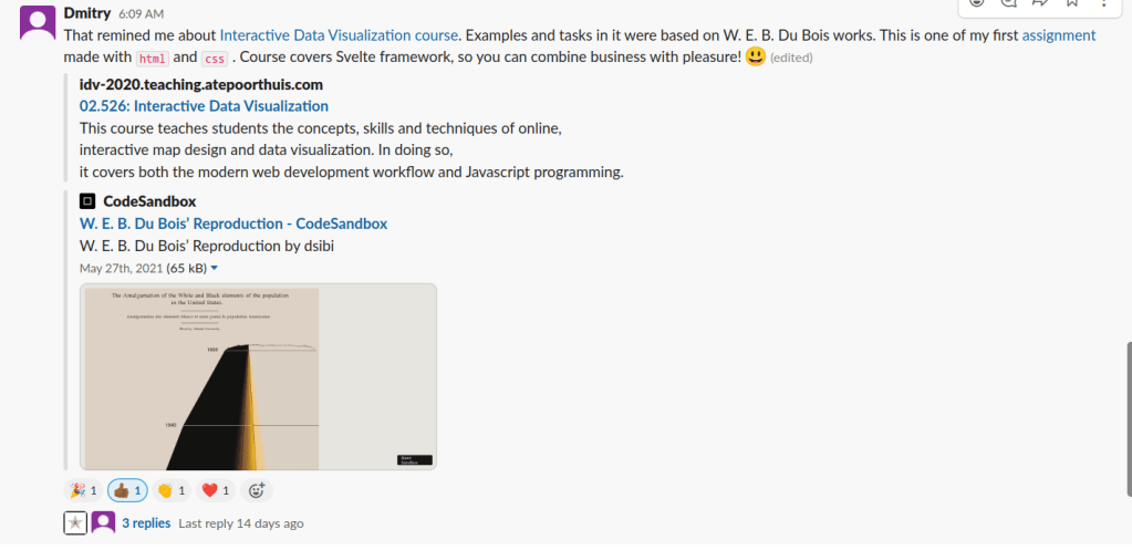“As someone who runs a community project, it’s important to me to also participate in community projects. Especially when the topics are related to diversity and inclusion. I was inspired by a lot of the work I saw coming out of the DuBois challenge last year and wanted to do at least one or two myself.”