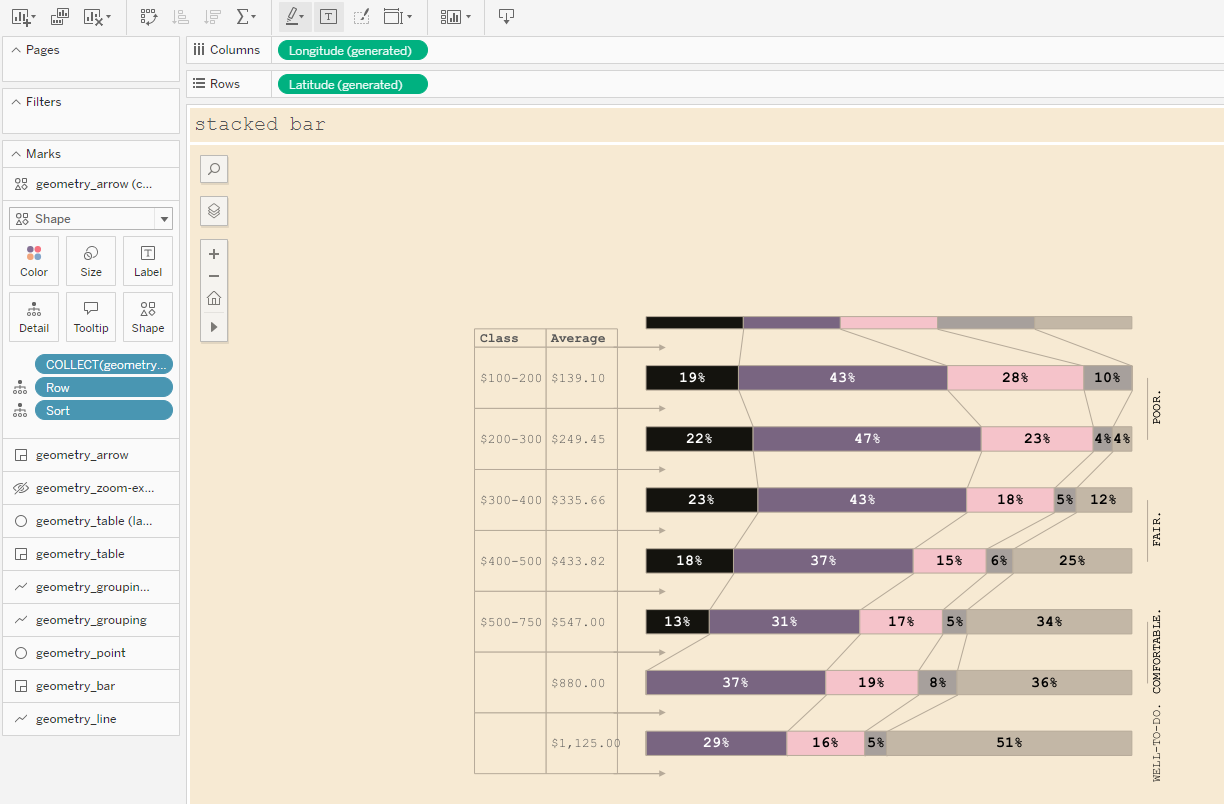 In his entry for Challenge 1 , Klaus Schulte uses map layers to recreate the chart from the original portrait in great detail, down to the lines connecting the bar charts at the different sections.