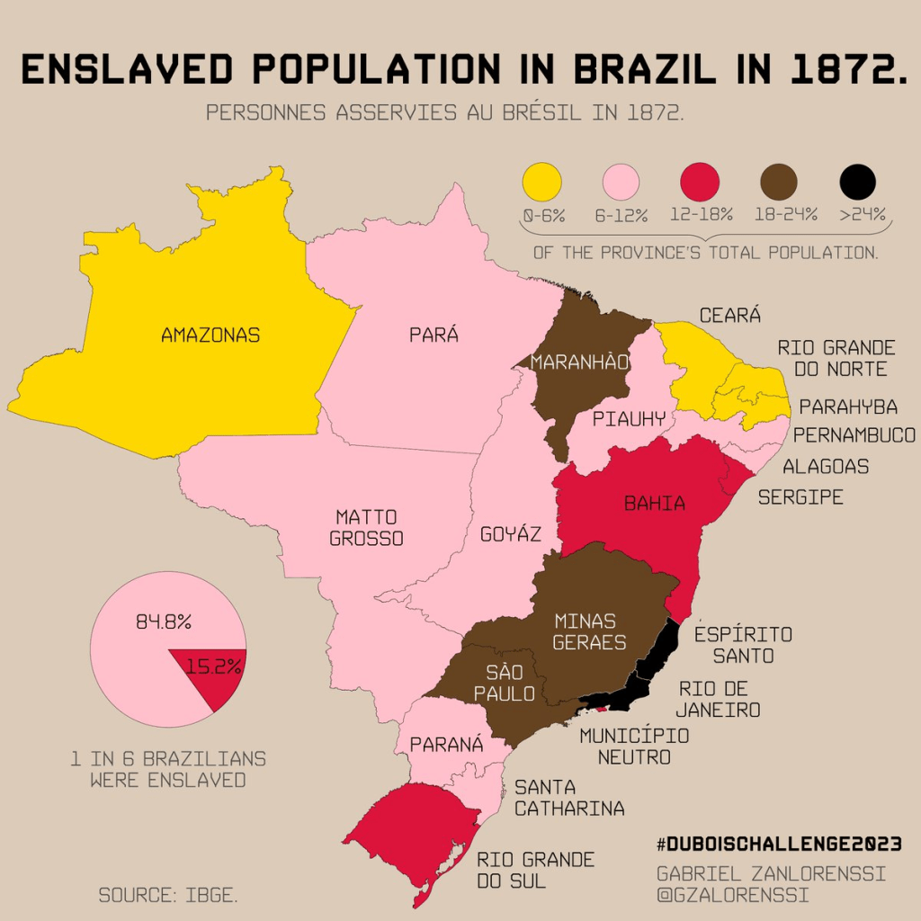 This map for Challenge 4 from Gabriel Zanlorenssi, in which he adapted the portrait to show the enslaved population of Brazil in 1872.
