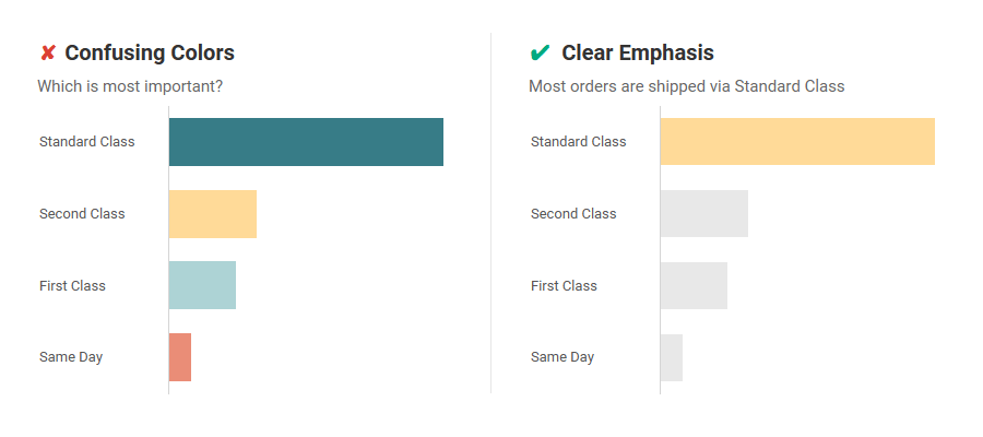 - Use greys and muted tones for background data and let your highlight color direct attention. Use it for key data points and story highlights.